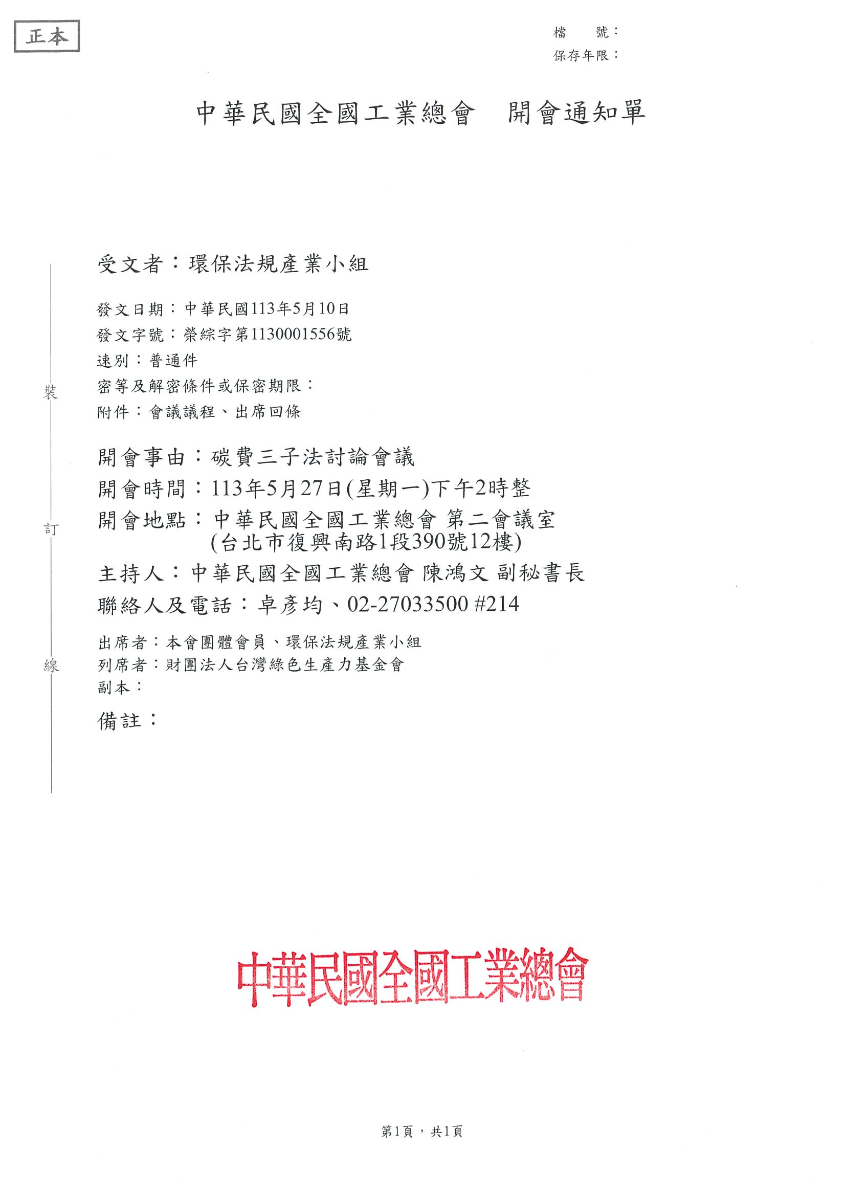 為綜整業界意見,工業總會於113年5月27日(一)下午2時召開碳費三項子法(草案)進行討論